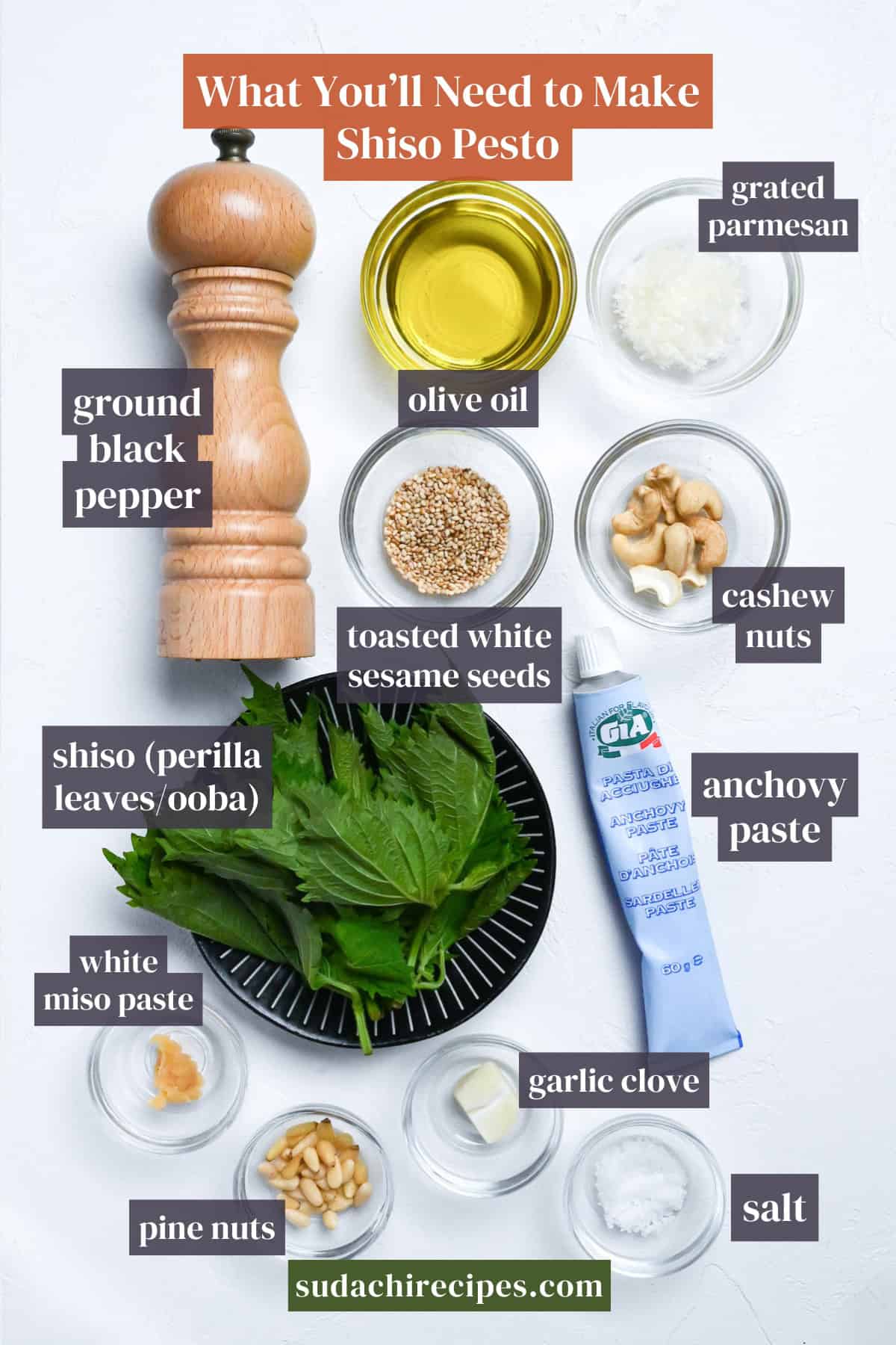 - In a food processor, add 2 ½ tbsp olive oil, 1 tbsp grated parmesan cheese, ½ tbsp toasted white sesame seeds, ½ tsp salt, ½ tsp white miso paste,¼ tsp ground black pepper, ¼ tsp anchovy paste, 15 g perilla leaves (shiso), 10 g cashew nuts, 5 g pine nuts and ½ clove garlic. Blitz until smooth, then store in the refrigerator until serving time.