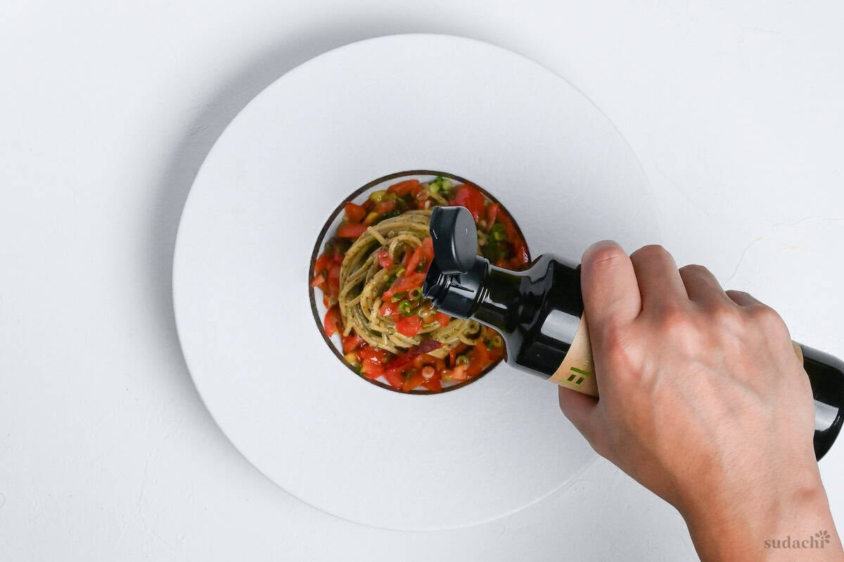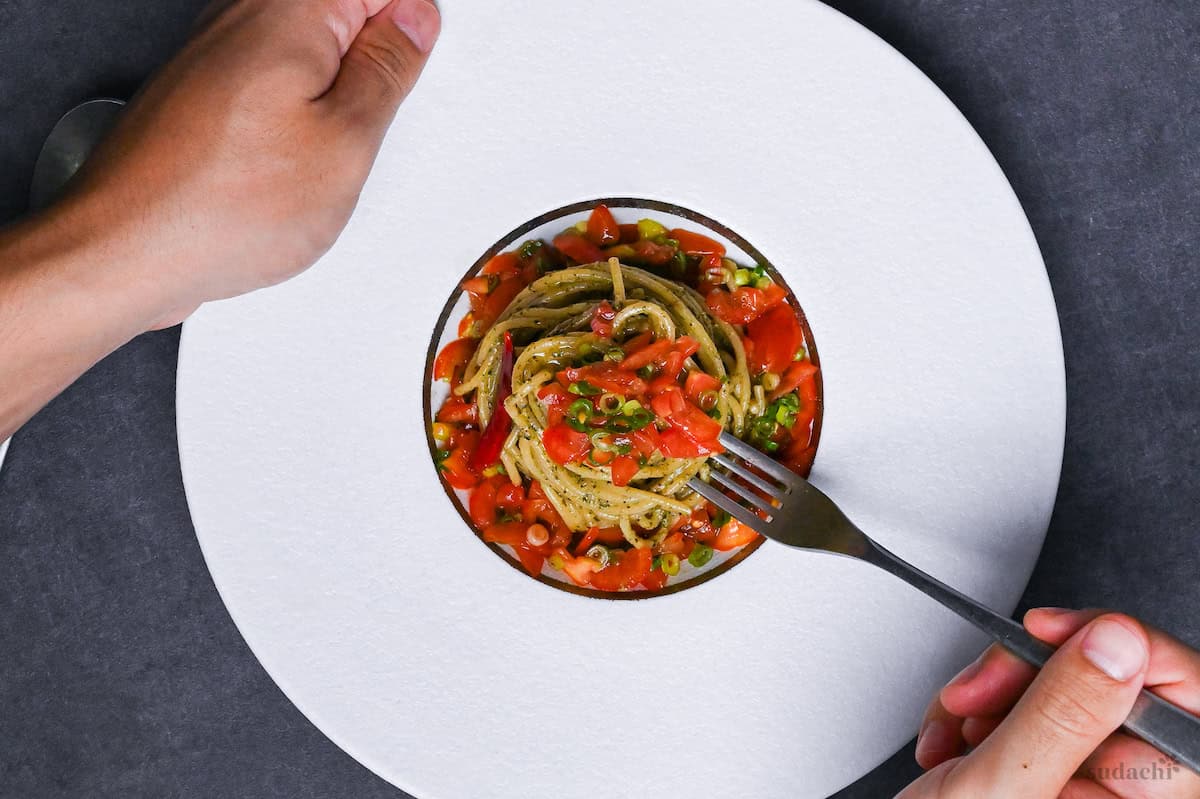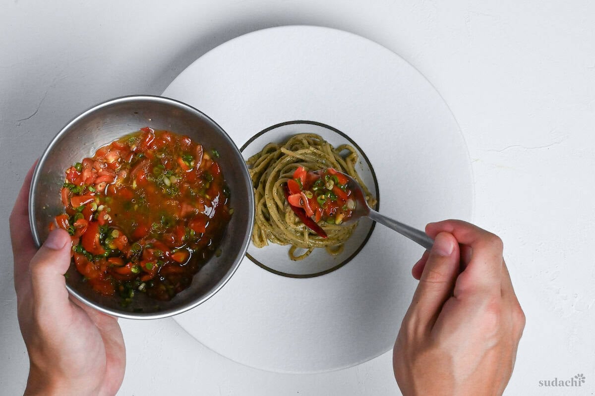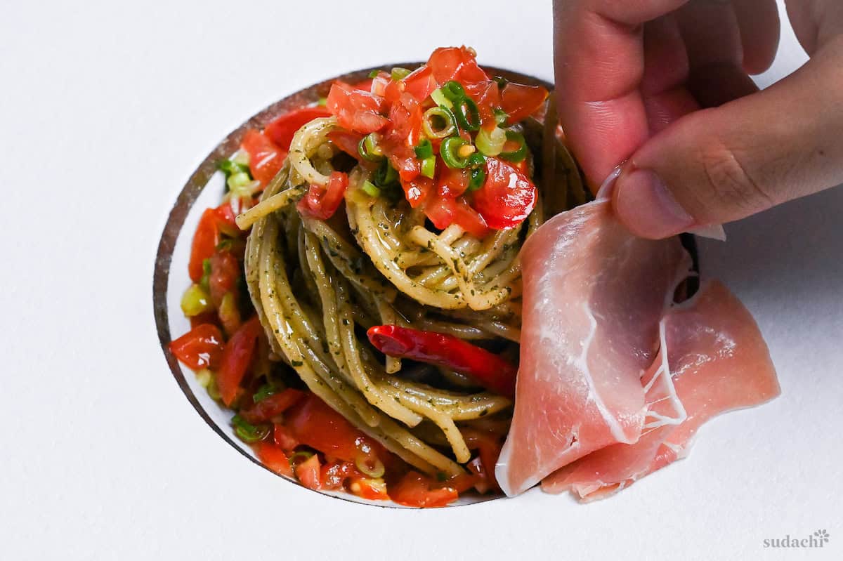 - What is it? Japanese-Italian fusion chilled pasta that uses up loads of shiso leaves in a vibrant pesto with marinated tomatoes.