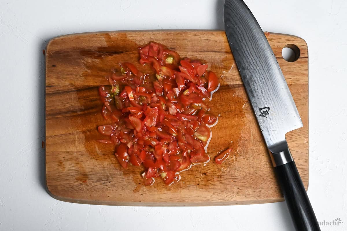 i. Start by cutting your cherry tomatoes into fine rough chunks.