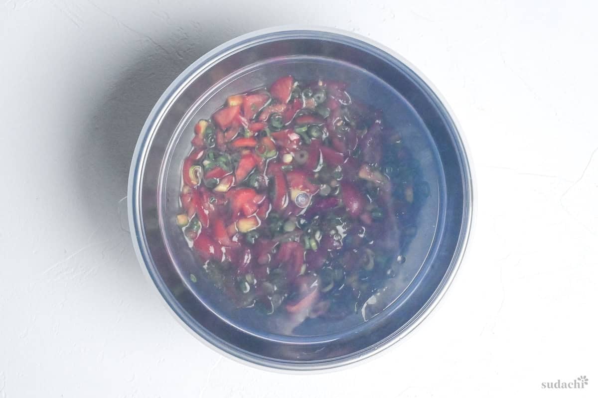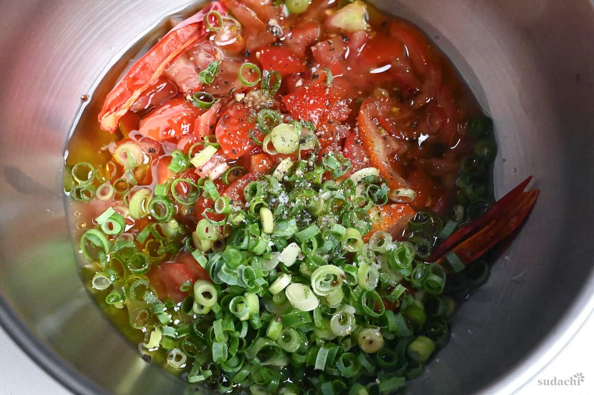 - Roughly cut 10 mini tomatoes and place them in a bowl along with 2 tbsp finely chopped green onions, 2 tbsp olive oil, 1 tsp lemon juice, ½ tsp balsamic vinegar, ¼ tsp honey, 1 dried red chili pepper, and 1 pinch salt and pepper. Mix well, then cover and rest in the refrigerator for 30 minutes.