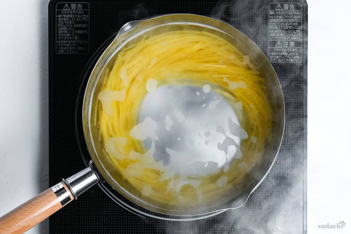- Bring a large pot of water to a rolling boil and add salt. Mix well, then place 200 g dry spaghettini into the pot and boil for 1 minute longer than the packaging states. While it cooks, prepare a bowl of ice cold water.