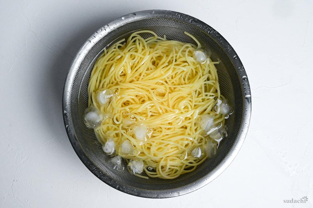 ii. The moment your pasta finishes cooking, drain it quickly in your prepared colander, then immediately plunge it into the ice water bath. Swish the noodles around for about 30 seconds until they feel completely cool to the touch.