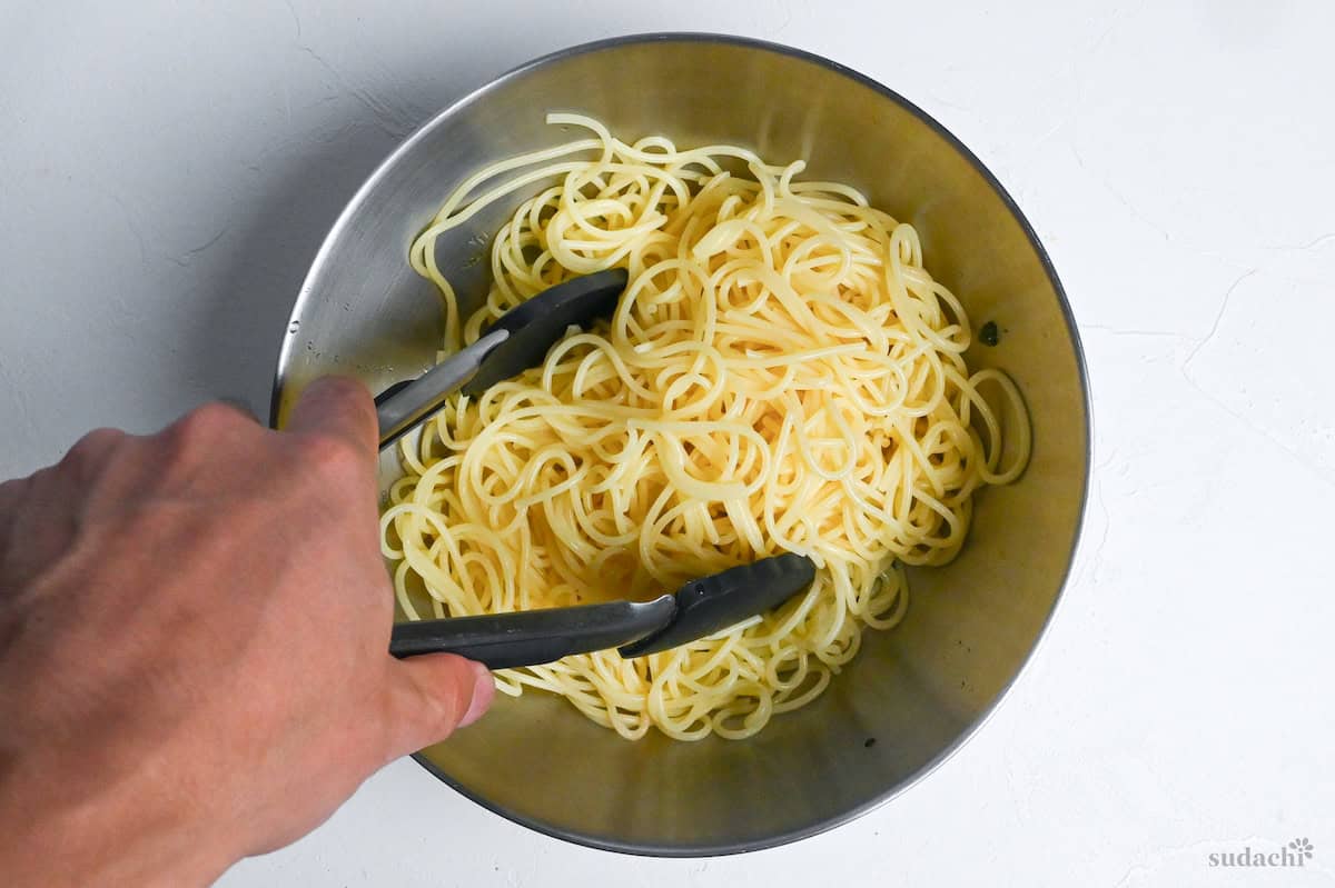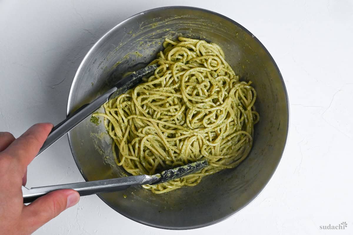 - Drain once more and shake thoroughly to remove excess water. Place the pasta in a large bowl and add the shiso pesto. Toss until every strand is evenly coated.