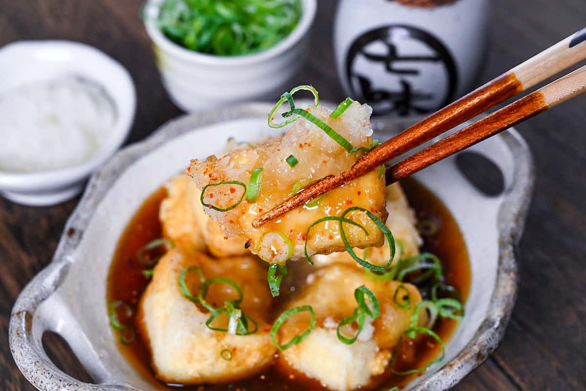 Generally speaking, tofu itself is vegan but most often dipping sauce isn’t as it contains fish essence. However, if you make dashi from vegan ingredients such as kombu or shiitake mushroom, it can easily be made vegan.