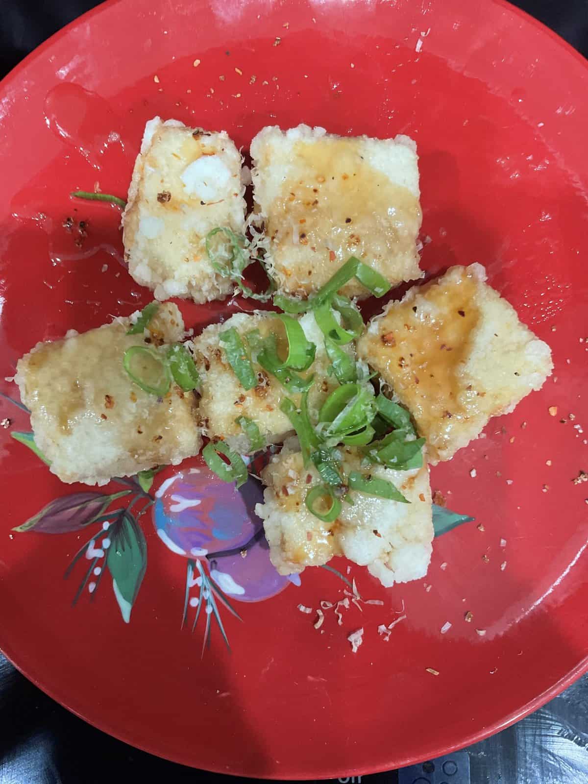 - Place the tofu in the serving bowl and drizzle with the sauce. Top with 1 tbsp finely chopped green onions, 1 tbsp grated daikon radish (daikon oroshi) and 1 pinch Japanese chili powder (shichimi togarashi) (optional).