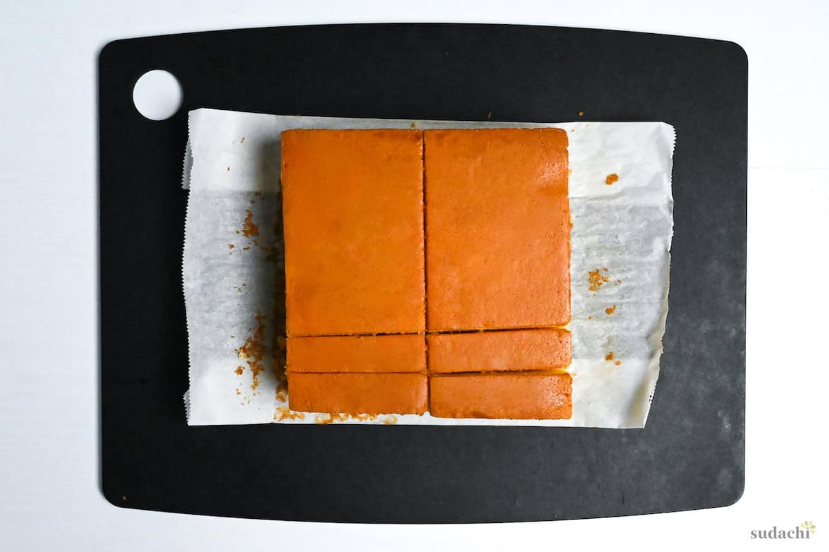 - After 12-24 hours of resting, unwrap the castella and trim the edges.