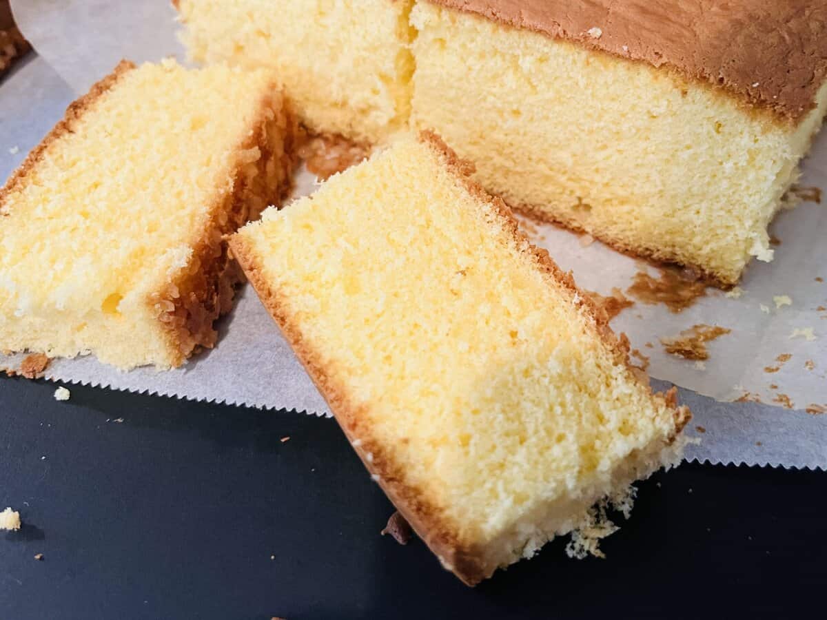 The defining characteristics of Castella cake are its smooth golden top, perfectly rectangular shape and intensely sweet flavor. It is also known for its texture, which is a beautiful balance of light and fluffy, yet moist, rich with a slight chewiness. This is achieved through the use of bread flour and whipped eggs, rather than using rising agents such as yeast or baking powder.